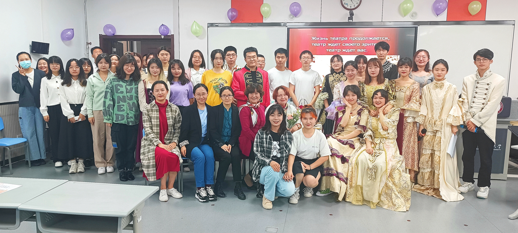 2022年5月12日下午15:30,beat365官方网站俄语中心、公司俄语系联合举办的五月俄语戏剧沙龙活动在教学六楼6301教室顺利进行。beat365经理刘全国、党委副书记鲁燕、俄语系主任孟霞,副主任王翠,俄语系外籍教师娜塔莉·察廖娃,俄语系教师段李敏、唐可欣及俄语系全体员工参与了此次活动。