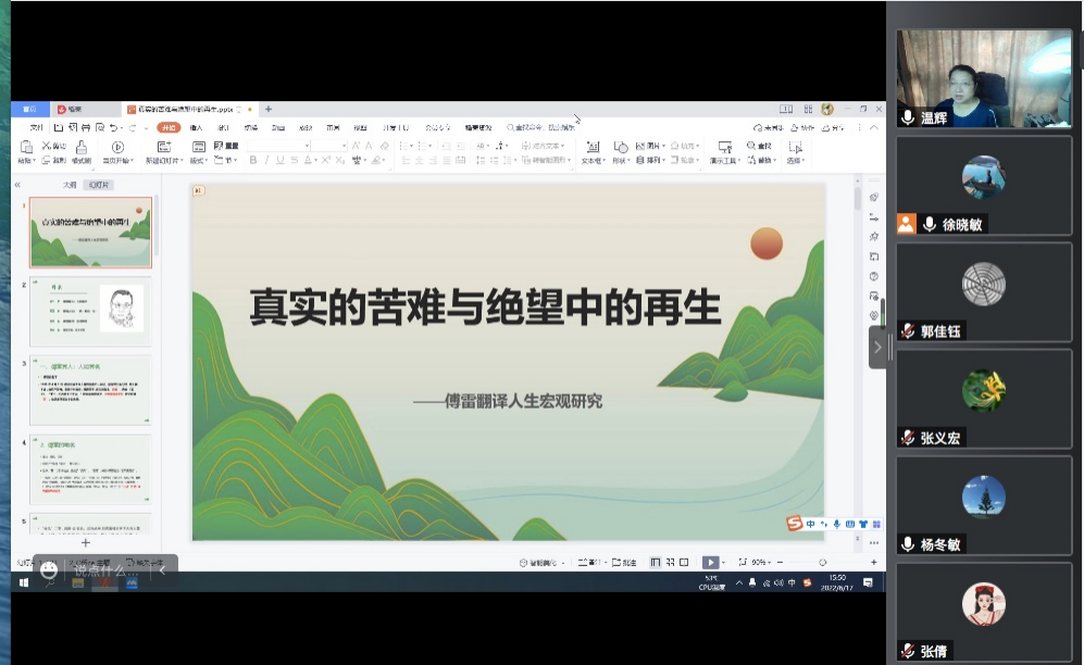 为了扩大公司师生的学术视野和学术兴趣,beat365于6月17日下午2:30以腾讯会议方式在线举办了“翻译教学与文化”系列活动第一次沙龙“真实的苦难与绝望中的再生:傅雷翻译人生宏观研究”。本次讲座由公司翻译系资深教师温辉老师主讲,beat365部分教师、研究生和本科生参加并参与讨论。
