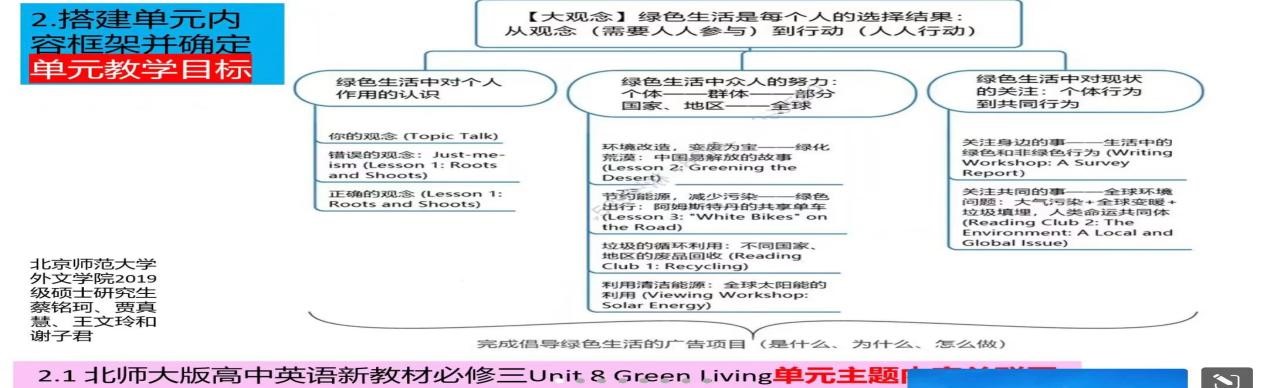 教师在进行备课时,需要从课程大观念出发,明确单元设计的指导思想,理清单元教学的核心理念,基于大观念对单元内课时目标进行整体规划,基于规划设计各语篇的教学活动,从而引导员工从不同侧面探究主题意义并建构小观念,最终形成单元大观念。王老师还强调要同步拟定课堂评价的方式和具体的评价要点,推进教、学、评一体化。