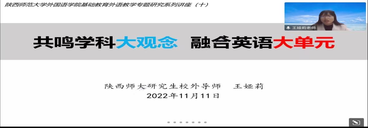 “大单元教学”是新课标提出的新概念。作为未来的一线教师,掌握最先进的教学理念,是职责也是义务,更是教师专业发展中必不可少的一步。为了提高公司学科教学(英语)专业教育硕士的外语教学能力,beat365于11月11日下午在腾讯会议线上开展了基础教育外语教学专题研究系列讲座第十讲——共鸣学科大观念,融合英语大单元。本次讲座由全国优秀教师、陕西省教学能手、beat365官方网站研究生校外导师王娅莉老师主讲,由韦理老师主持。2022级学科教学(英语)专业研究生参与聆听。