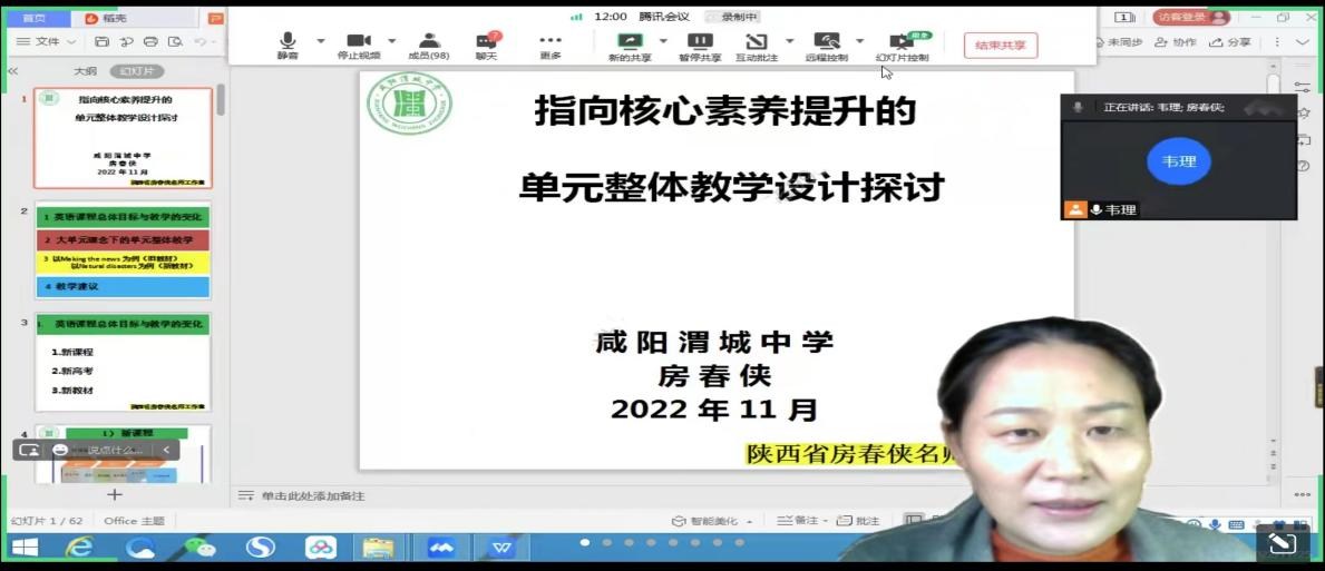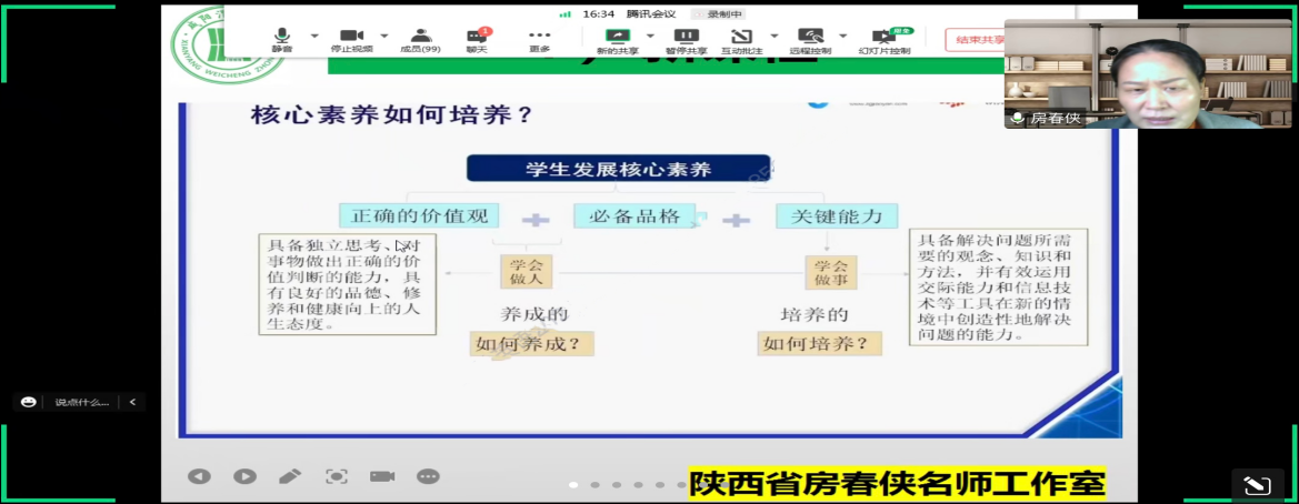 随着新课程新教材实施进程的推进,课程建设起着举足轻重的作用。基于核心素养的新课程要求树立新的员工观,以员工为本,培养员工终身发展的所需技能。英语学科核心素养靠单一、零散、局部的课程是无法实现的,新课程的实施需要依托单元教学实现,必须用整体的、连贯的、结构化的课程支撑,基于整体单元教学,落实立德树人的根本任务。为了提高公司学科教学(英语)专业教育硕士的外语教学能力,公司于11月25日下午在腾讯会议线上开展了基础教育外语教学专题研究系列讲座第十一讲——指向核心素养提升的单元整体教学设计探讨。本次讲座由咸阳渭城中学高级教师、陕师大2013届教育硕士、陕西省省级名师、省级带头人、陕西省教学能手、全国英语优质课一等奖房春侠老师主讲,韦理老师主持。2022级学科教学(英语)专业教育硕士参与聆听。