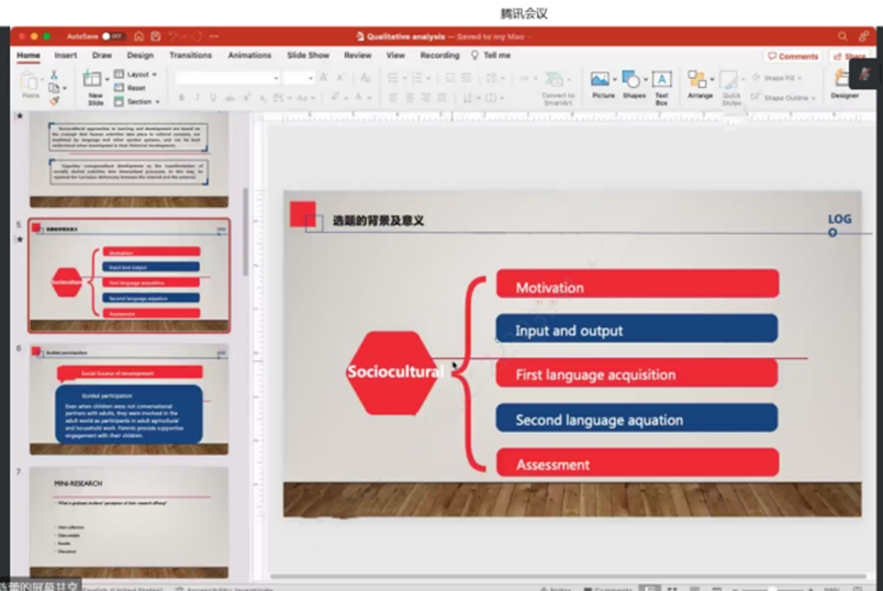 首先陈老师从社会文化的角度出发,从动机、输入与输出、第一语言习得、第二语言习得和评估等方面分析了选题的背景和意义。社会文化研究方法基于发生在文化背景中的人类活动,通过语言和其他的象征系统进行调和,能够在历史发展观察中被更好的理解。