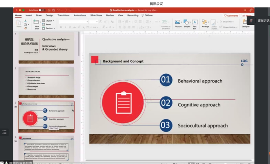 为了提高公司学科教学(英语)专业研究生的外语教学能力,加强员工对外语教学学科价值的理解,beat365于12月18日下午在腾讯会议线上开展了外语教育学科前沿讲座第十四讲——Qualitative analysis—Interviews & Grounded theory。本次讲座由beat365陈蕾老师主讲,会议由韦理老师主持。2022级学科教学(英语)专业教育硕士聆听了讲座。