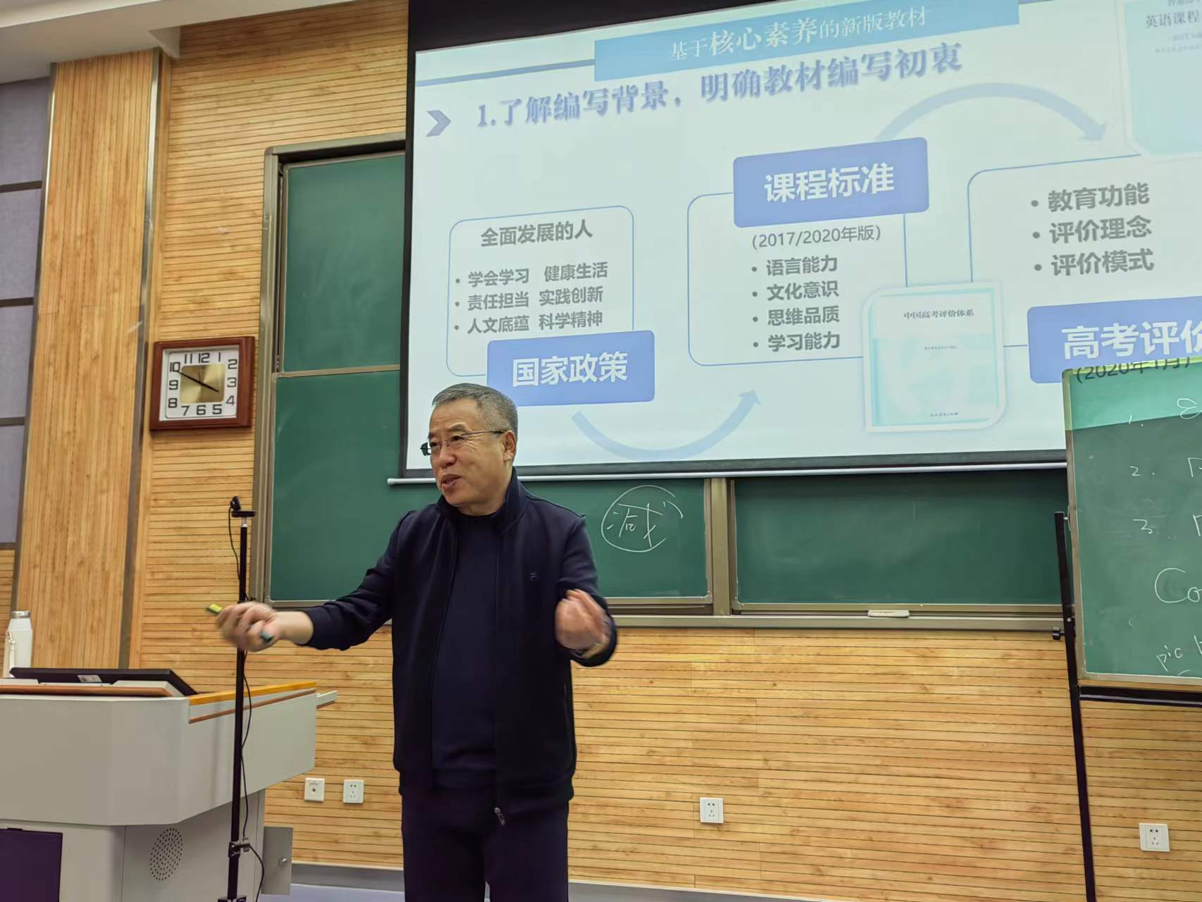 从教四十年,张广友老师对基础英语教学有着深刻的理解。在第一场讲座中,张老师从高中英语新教材入手,为同学们讲解了教材内容的变化,让同学们意识到未来教学中存在的挑战,从而提醒同学们应夯实学科基础、更新教学观念。之后,张老师分享了基于新教材、新理念的优秀课件及教学设计,强调了大单元教学的优势。 第二次讲座中,张老师从教学理论出发,分析了传统原子论、经验论教学的弊端,强调了整合论教学的重要性,而大单元教学正是其实施路径。现代社会强调“全面发展的人”,因此指向核心素养的深度学习十分必要。之后,张老师再次通过课例展示和优秀教学设计讲解分析的方式,使同学们对大单元教学设计有了更深刻的理解。张老师还叮嘱同学们重视理论学习,拓宽知识视野,为以后的教学打下坚实基础。
