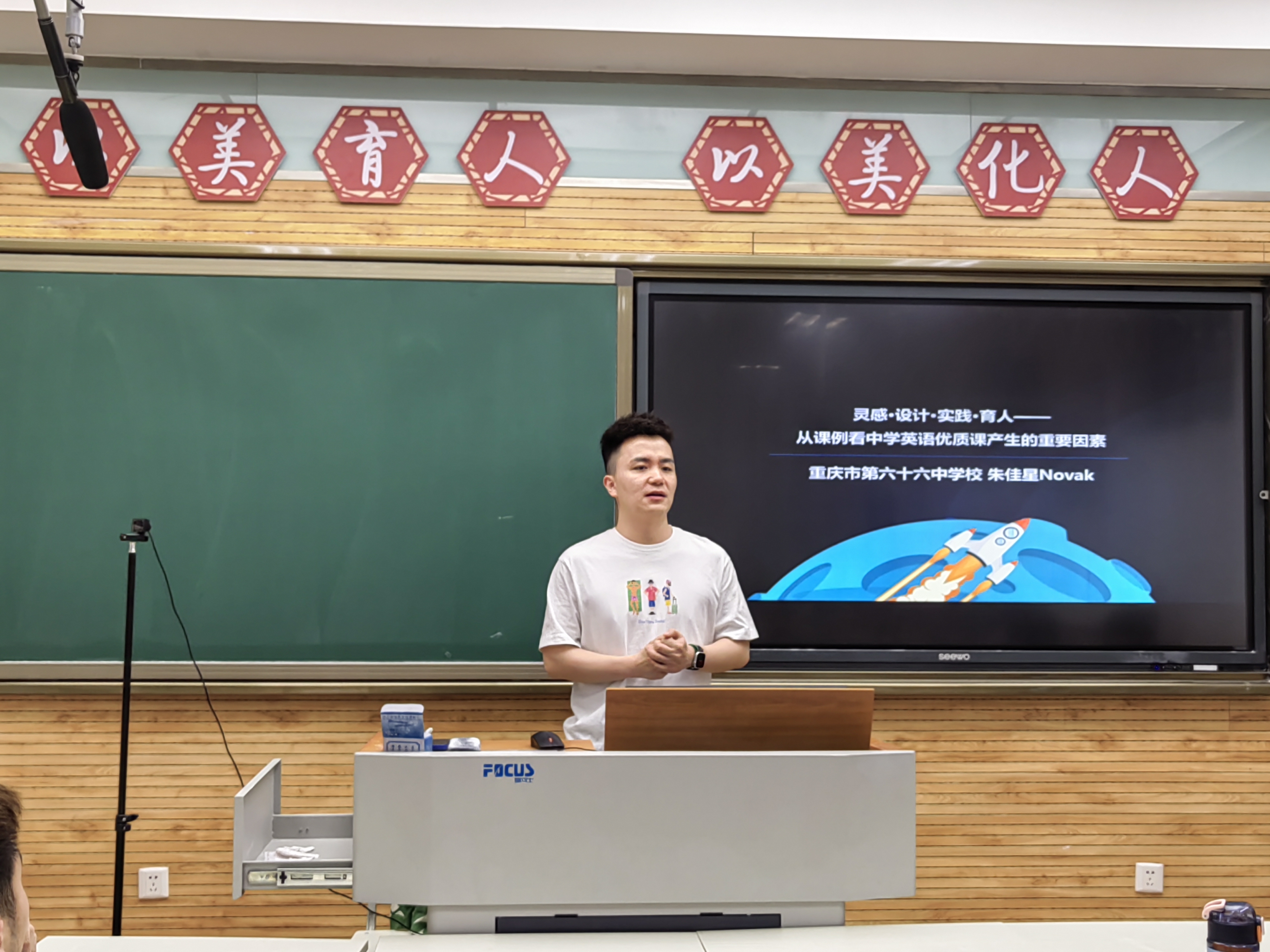 第一位分享人朱佳星现任重庆市第六十六中公司德育处主任、高三年级支部书记、年级主任,高中英语教师。工作 9 年,他屡次斩获国家级、省市区级等各大奖项,工作经历也曾被多家媒体报道。朱佳星围绕“从课例看中学英语优质课产生的重要因素”这一主题,强调把时政和热点巧妙地结合起来,课堂要回归到“立德树人”,要把课堂还给员工。最后,朱佳星强调,外语专业员工,尤其是师范生的使命是学好一门外国语言,讲好中国故事,培育好每一个员工。