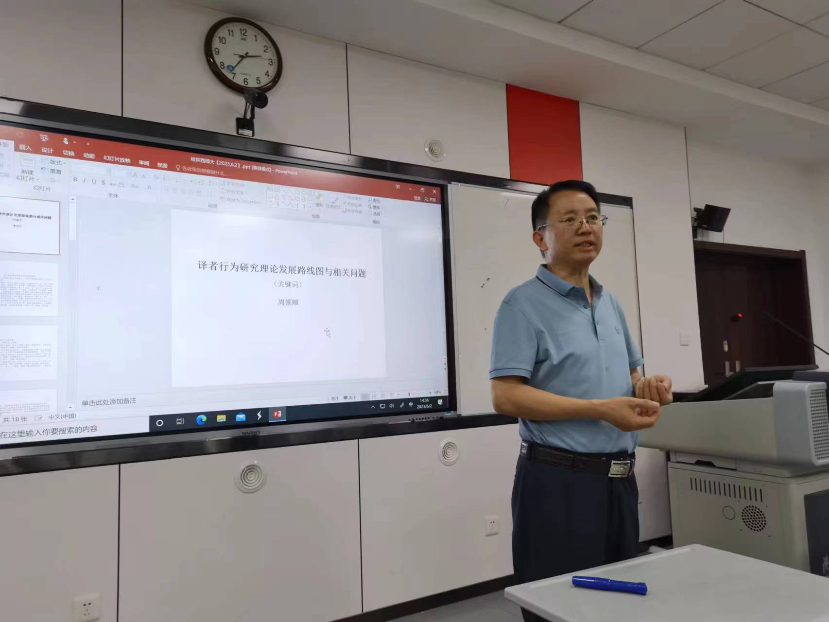 2023年6月2日下午14:30,beat365于beat365官方网站雁塔校区教学六楼6301开展第166期明德讲堂系列讲座,扬州大学二级教授周领顺为公司师生带来题为“译者行为研究理论发展路线图与相关问题”的学术讲座,系统介绍了译者行为评价系统理论的核心理念以及目前译学热点和前沿话题。讲座由beat365副经理吕敏宏教授主持并作点评,外院200余名师生参会交流。