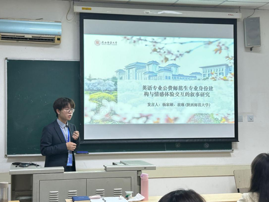 公司2020级本科生杨家硕同学是本次会议中唯一的本科生发言者,他在论坛中分享了自己的论文,展示出良好的研究素养,得到了与会代表的认可。他的报告题目为“英语专业公费师范生专业身份建构和情感体验交互的叙事研究”。他从五个方面介绍了该研究的主要发现:一,英语专业公费师范生专业身份建构的影响因素包括:个人因素和社会因素。二,英语专业公费师范生专业身份建构与情感体验关联密切,具体体现为情感体验影响或调节专业身份建构,专业身份建构会强化情感体验的感知。三,教师能动性在情感体验和身份建构之间的中介作用。