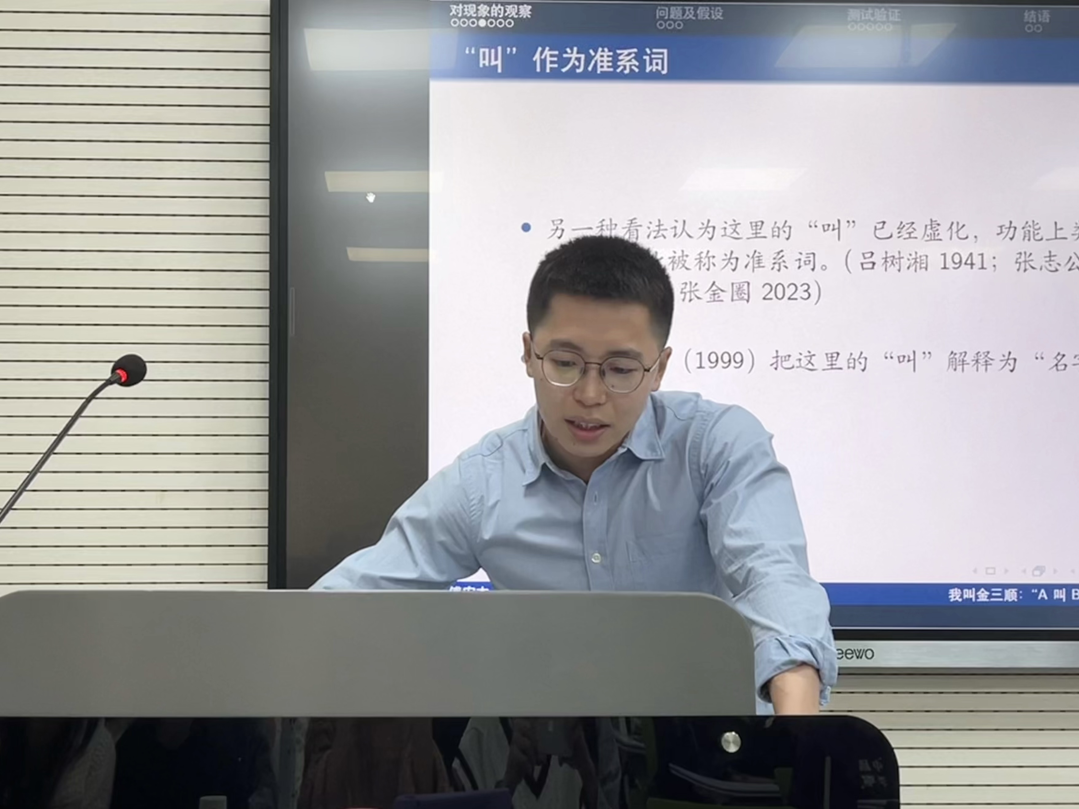 傅宏杰以《我叫金三顺:“A叫B”结构作为一种范畴化关系》为题,呈现了从现象到问题再到理论阐释的思考过程,并且做出以下两点强调:一是不同的成分“B”能够进入“A叫B”结构是因为受到了构式压制。二是构式压制并非完全自由,还需要满足三点潜能。