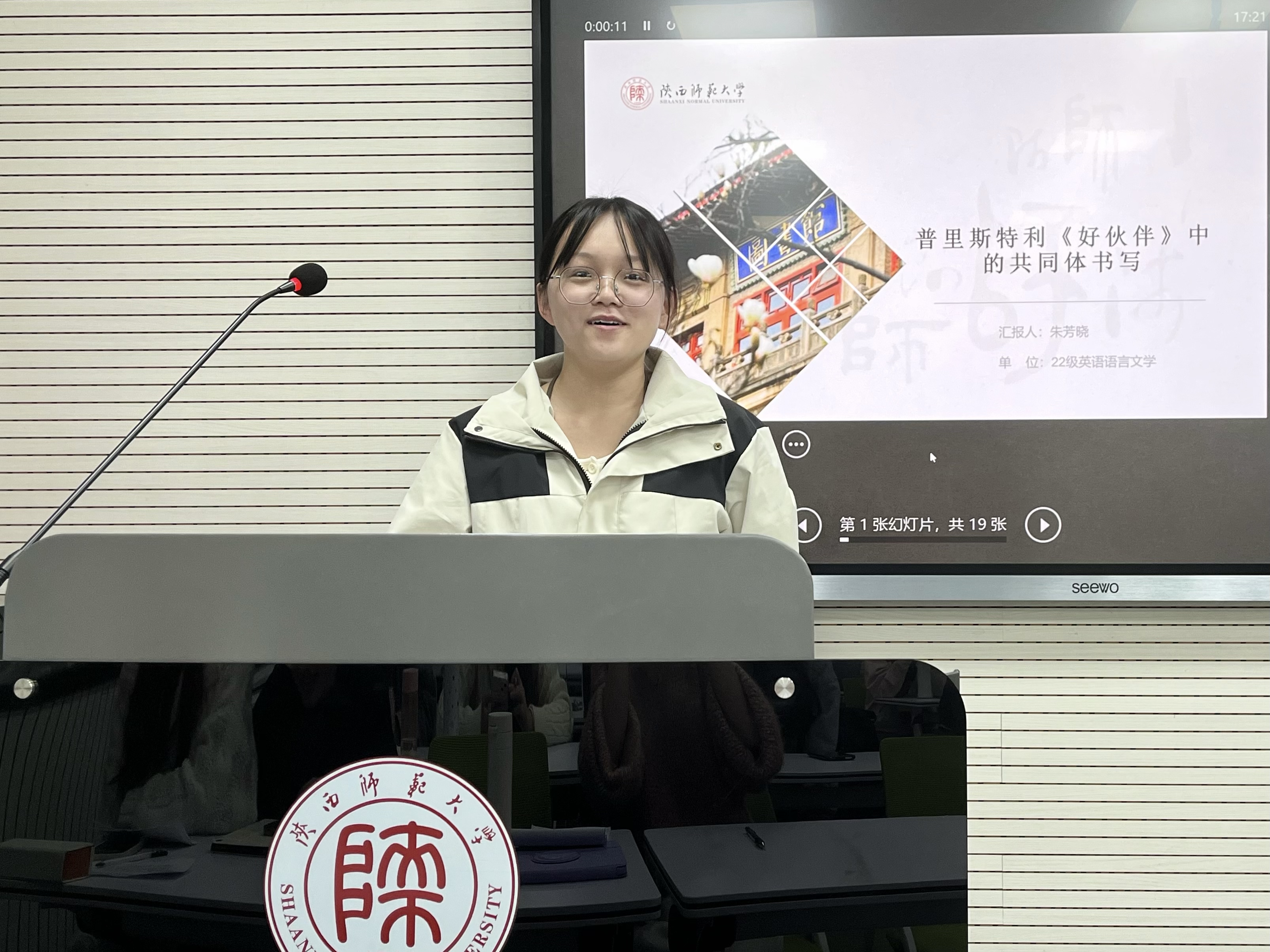 郭雯婷以《福柯权力理论视角下〈小城畸人〉畸人形象解读》为题,从畸人的声音和话语、性与身体、形成原因以及结语四个方面进行了分析汇报。
