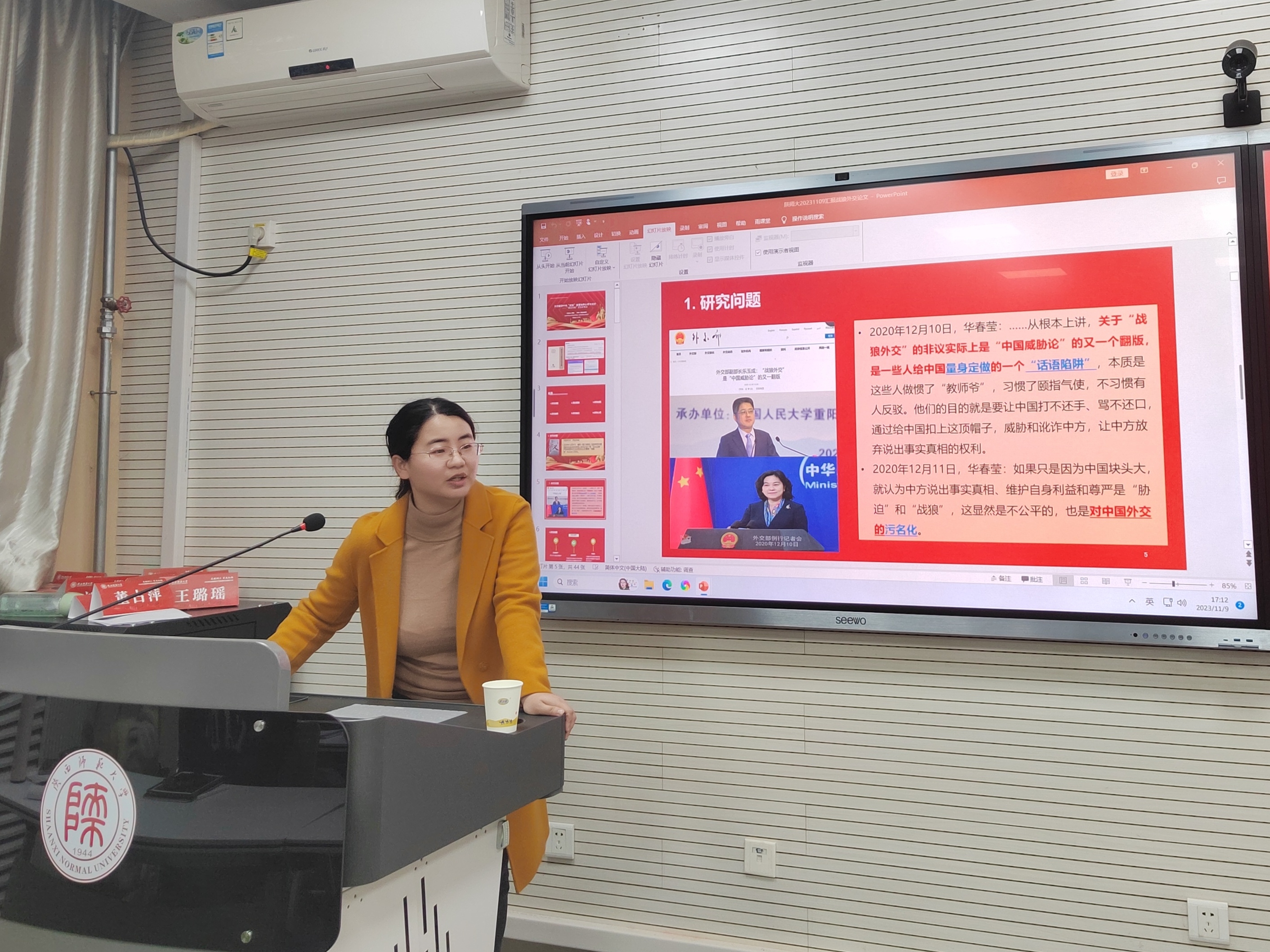 顾菁以《外交翻译中的‘战狼’话语陷阱分析与应对》为题,从翻译学角度出发,结合国际政治学和社会学理论进行跨学科研究。她从研究问题、理论框架、研究过程、转换视角以及结果讨论五个方面论述,并结合自身经历为在座同学提供了实用的科研建议。