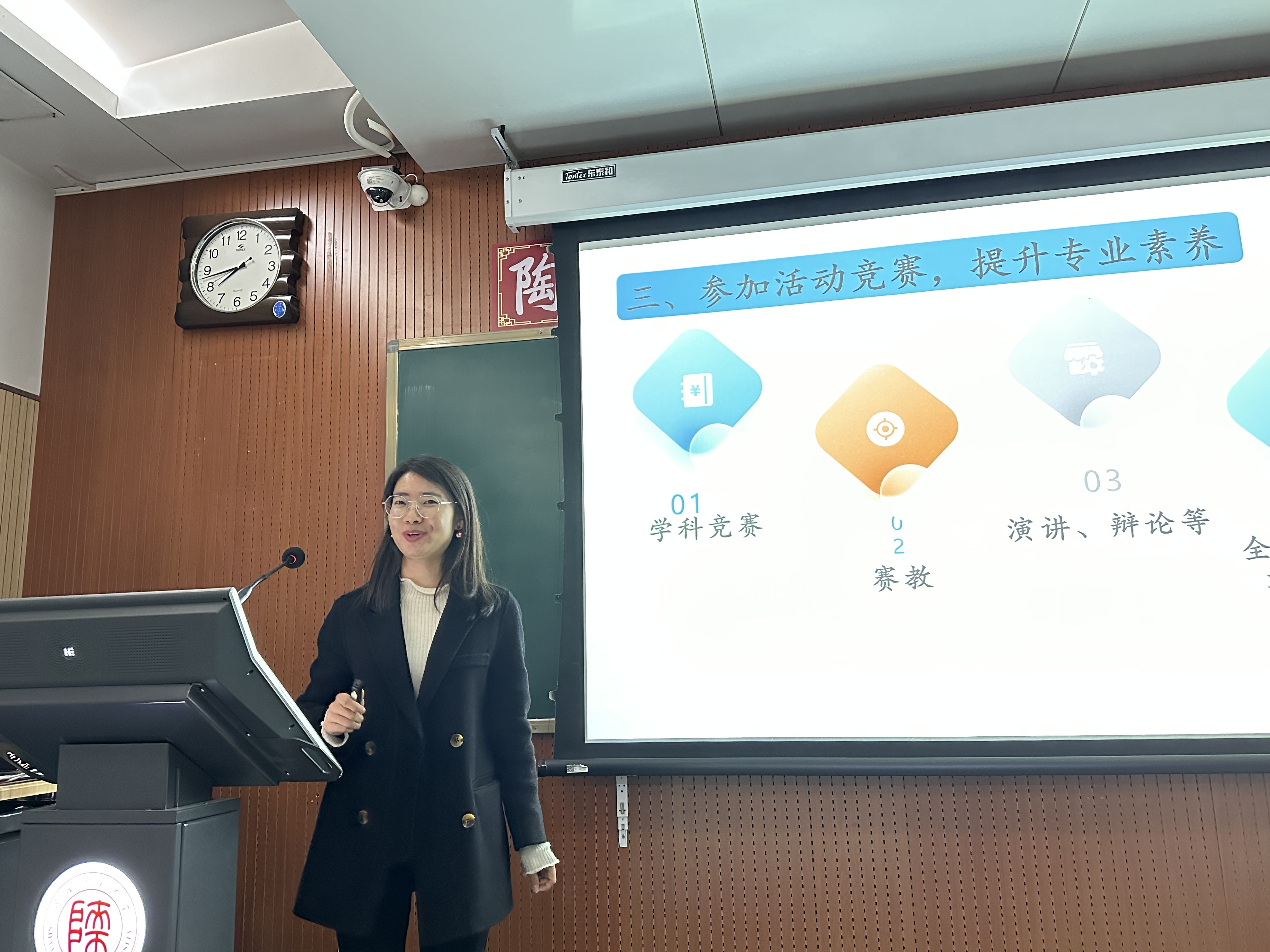 李丽丽还详细讲解了教师应该如何应对不同的角色与身份并保持自我提升的问题。她鼓励同学们在今后工作中要勇于尝试,全面发展,在做好教学一线工作的同时也要深入学习理论知识,做一名研究型教师。
