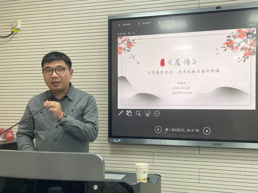 林嘉新教授从研究背景、《左传》介绍、《左传》百年英译史、《左传》在英语世界的接受以及启示与价值五个方面进行了讲解。他还原再现了《左传》在英语世界的译介、传播与接收的历史,为如何提升中华文化国际传播力提供借鉴,从而更好地推动中华文化走向世界。林教授指出,《左传》的英文译介行为绝大部分发生在英语世界内部,总体呈现为“接受性”译介,且与西方学术风向、语境一致。每种译本都是时代的产物,因此翻译时必须考虑时代需求。西方学者对《左传》的翻译在一定程度上赋予其异域的生命活力。他强调了该译本对中国学者研究的重要价值,并阐释了增进中西学术文化交流的必要性。