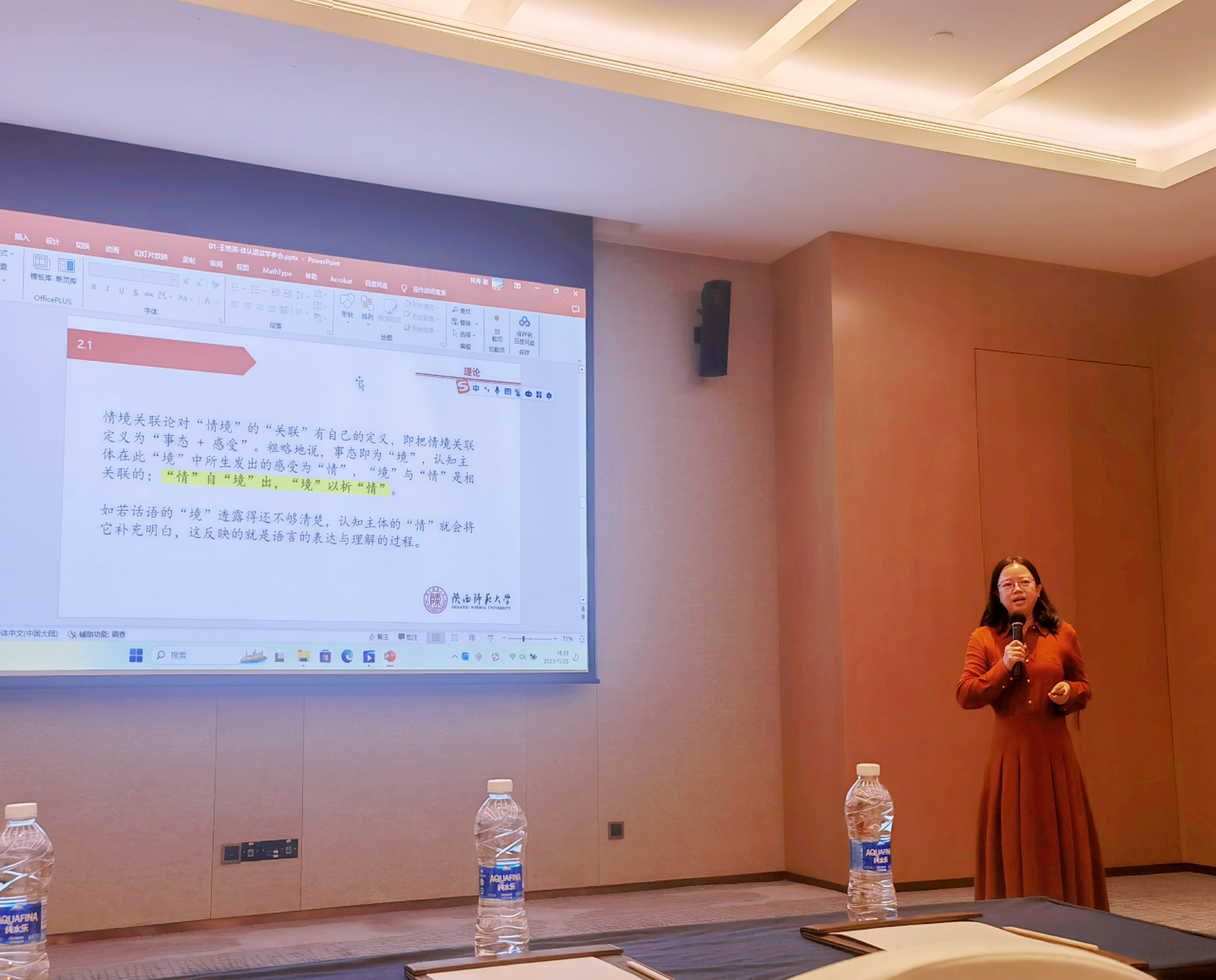 公司王艳滨副教授作为体认语言学专委会的常务理事之一,应邀出席此次会议,作了题为“术语变体的体认意义生成机制研究:情境互动视角”的会议发言,指出术语变体作为一种词义发生变异的语义表达,其体认意义生成不仅取决于语言本身,也取决于语言主体与语用环境的互动。王艳滨副教授还作为第四分会场“体认语言学与二语习得研究”的点评人,对分会场的16位学者的发言进行了细致全面的点评,与会报告者纷纷表示王艳滨副教授的点评意见中肯到位,富有启发性,有助于进一步完善研究论文。