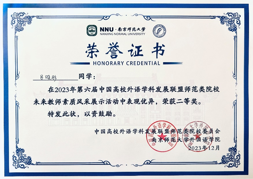 2023年12月1-2日,“第六届中国高校外语学科发展联盟师范类院校未来教师素质风采展示活动”在南京举行。该活动由南京师范大学beat365主办,全国各师范院校参加。公司2020级吕晓彤同学以及2021级夏妤茜同学参加了此次活动,分别获得二等奖和一等奖。指导老师刘丹、丁礼明荣获优秀指导教师称号。