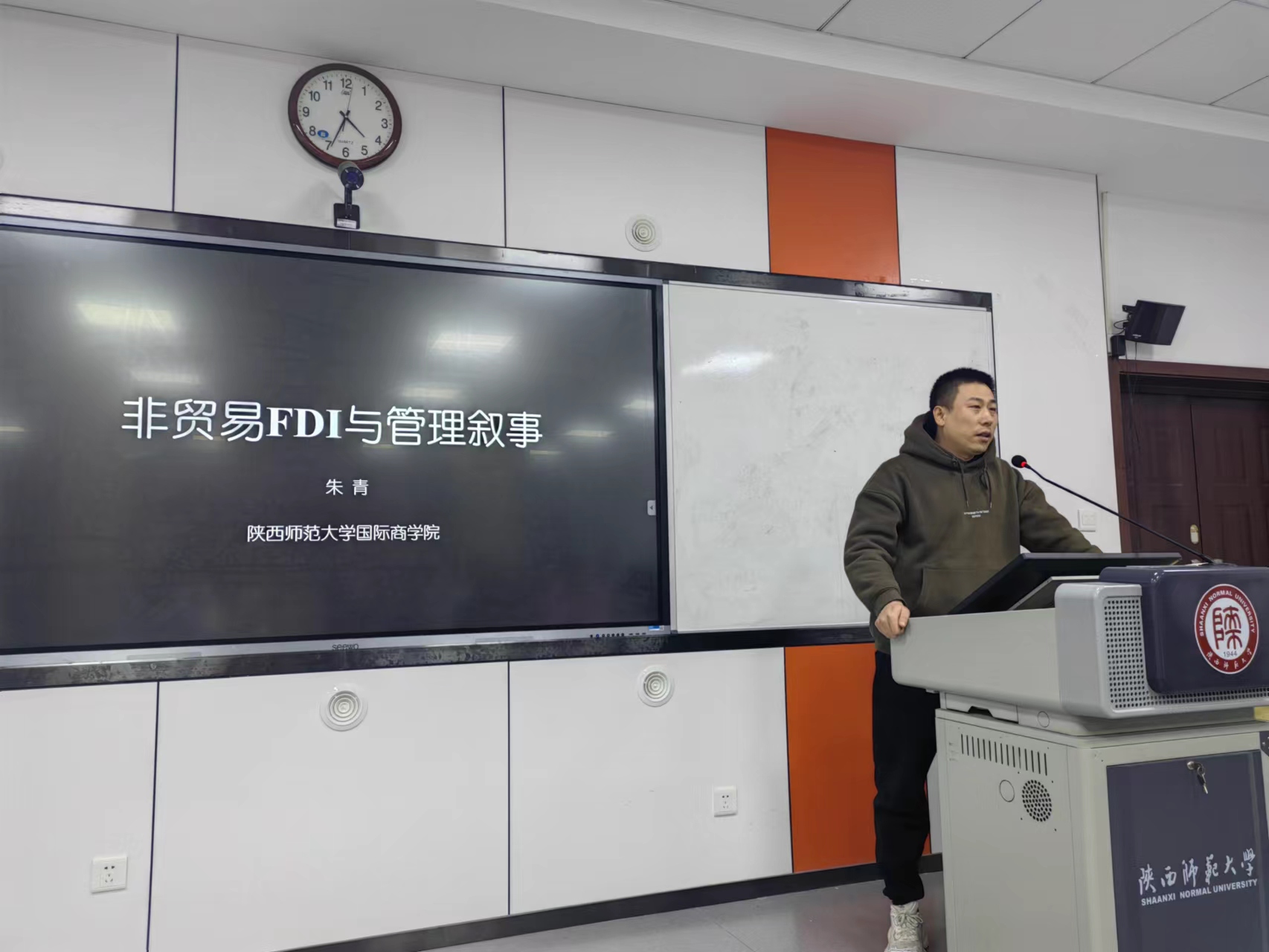 为拓展外语学子的国际视野,培养跨文化管理能力,12月21日下午,公司在6301教室举行了第30期会通讲堂,本次讲座以“非贸易FDI与管理叙事”为主题,特邀西安市青年科技人才、第十四届陕西青年科技奖获得者、公司国际商公司朱青教授进行主讲。讲堂由鲁燕副书记主持,来自公司全球胜任力与青年发展工作坊及各年级100多名同学现场聆听。