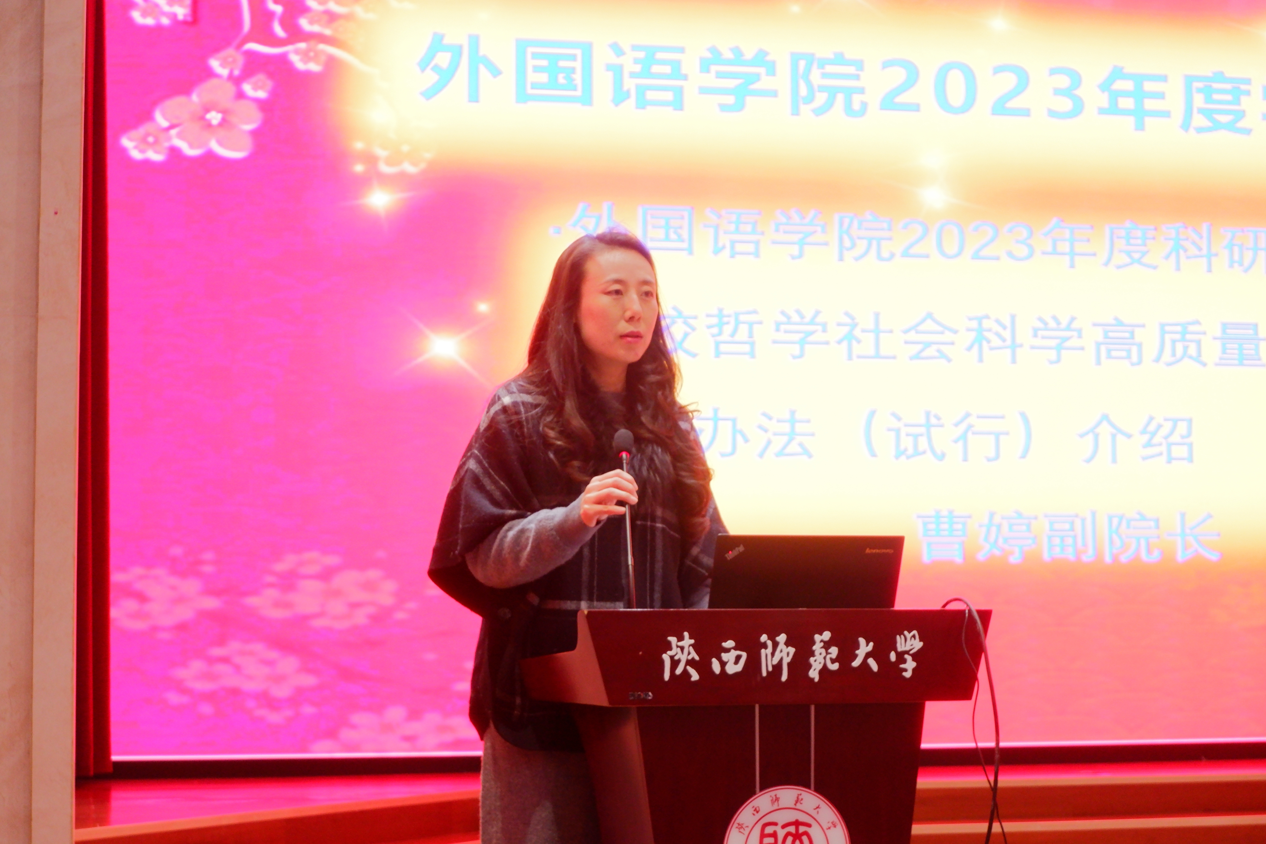 副经理曹婷教授总结了公司在过去一年中所取得的学术成果,介绍了公司《哲学社会科学高质量发展科研业绩认定办法(试行)》,并鼓励各位教师继续保持昂扬的斗志,共同迎接即将到来的2024年。