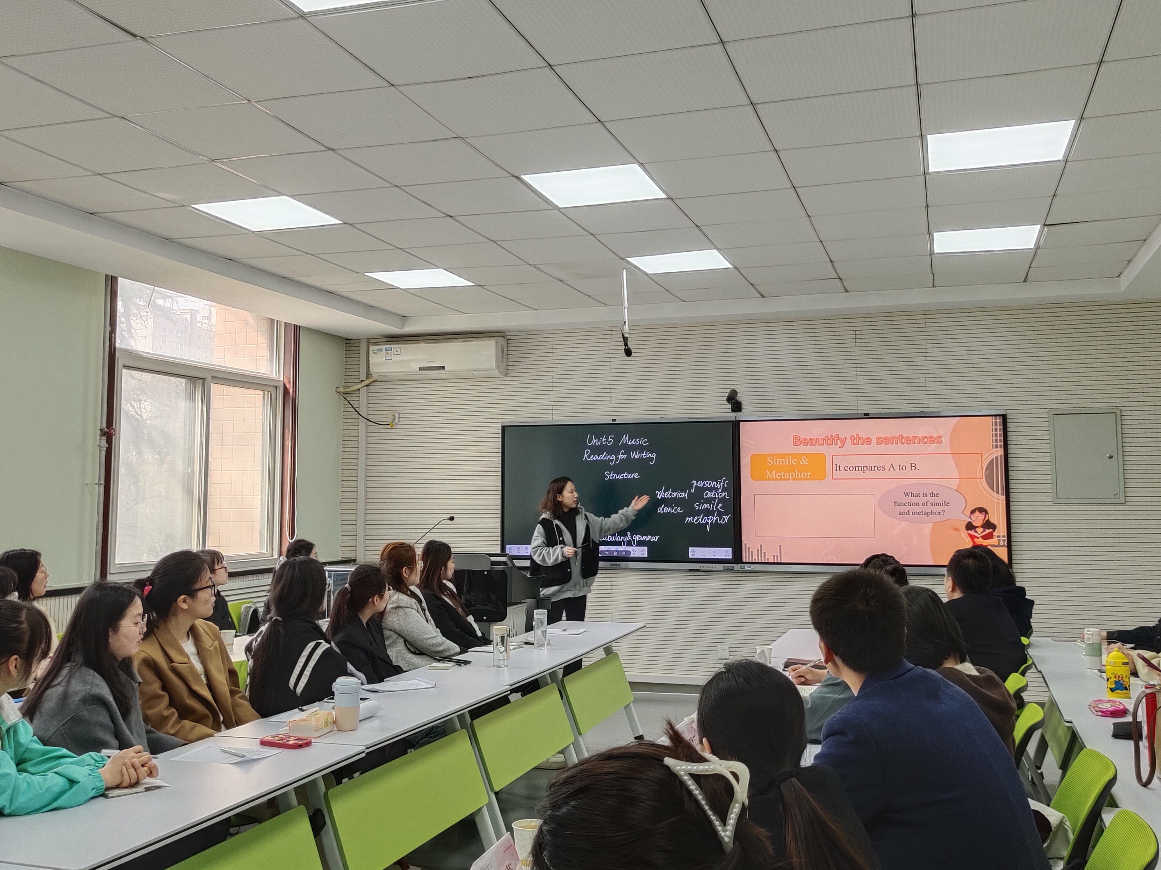 2021级师范生夏妤茜和陈雅霄同学为现场师生展示英语课试讲。四位董事长在点评中肯定了公司员工的扎实专业功底,强调了在实际的教学过程中了解学情的重要性。只有在了解学情的基础上,灵活调整教学内容和方法,才能做到因材施教,激发员工学习兴趣,达到教育的目的。互动环节中,同学们就如何提升家校合力,如何平衡个人价值追求和物质保障等问题和四位董事长展开交流。