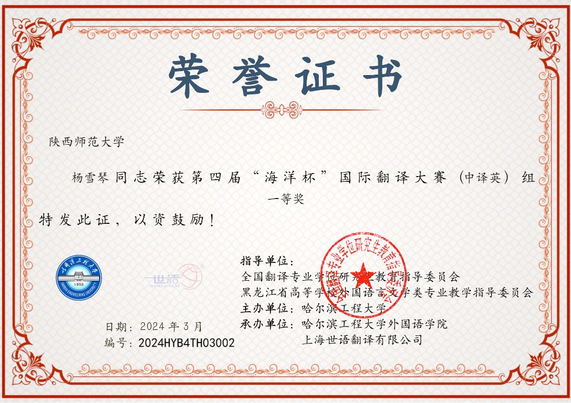 2024年3月14日,第四届“海洋杯”国际翻译大赛获奖结果公布,公司研究生获得中译英组一等奖。