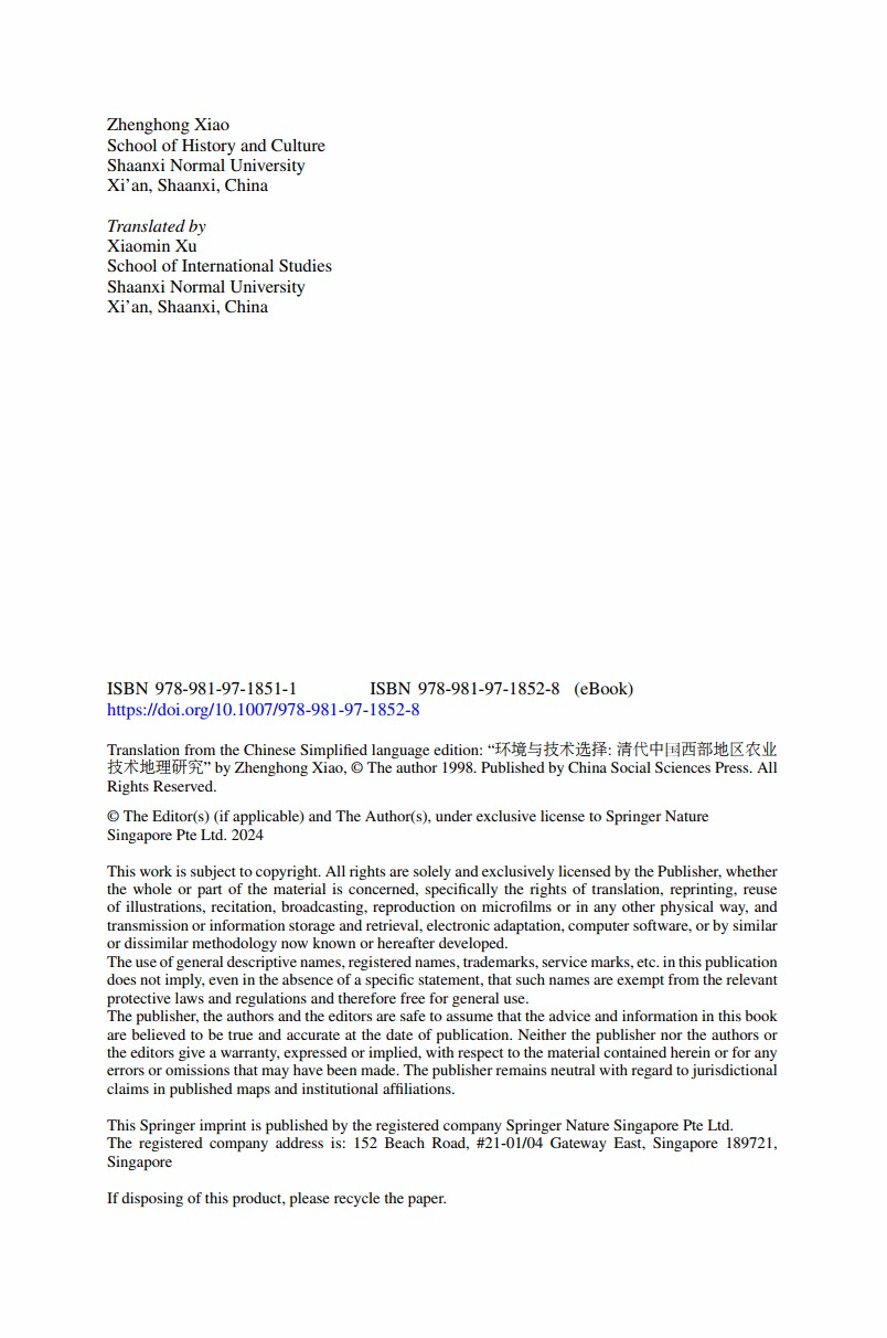 原著:《环境与技术选择:清代中国西部地区农业技术地理研究》 ,作者:萧正洪。中国社会科学出版社,1998年。2002年获第四届吴玉章人文社会科学优秀奖,2003年获教育部中国高校人文社会科学优秀成果奖三等奖(历史学)。2024年由徐晓敏副教授译著在Springer出版。