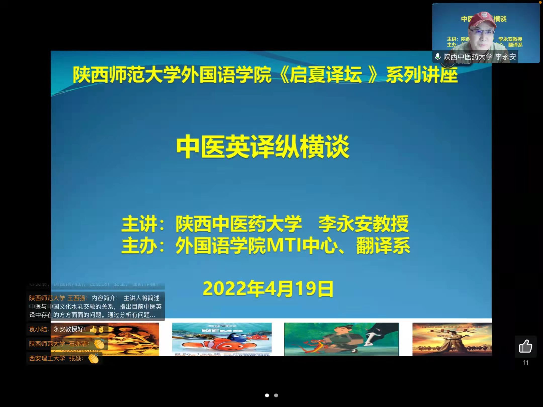 2022年4月19日,beat365“启夏译坛”第4讲暨“翻译实务系列讲座”第4季第5讲《中医英译纵横谈》云端开讲。讲座由陕西中医药大学beat365经理、国际教育公司经理李永安教授主讲,公司尚亚宁教授与谈,王西强教授主持报告并总结,全国多所高校的专家、学者和员工及公司师生线上参加讲座并积极互动。