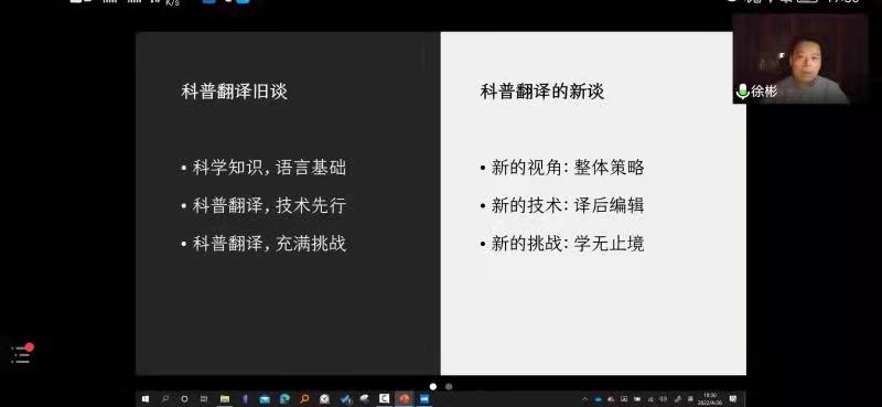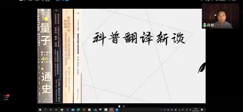 2022年4月26日,beat365“启夏译坛”第5讲暨“翻译实务系列讲座”第4季第6讲《科普翻译新谈》云端开讲。讲座由山东师范大学外语公司教授、翻译家徐彬教授主讲、公司杨冬敏博士与谈,王西强教授主持报告并总结,全国多所高校的专家、学者和员工及公司师生共计200余人线上参加讲座并积极互动。