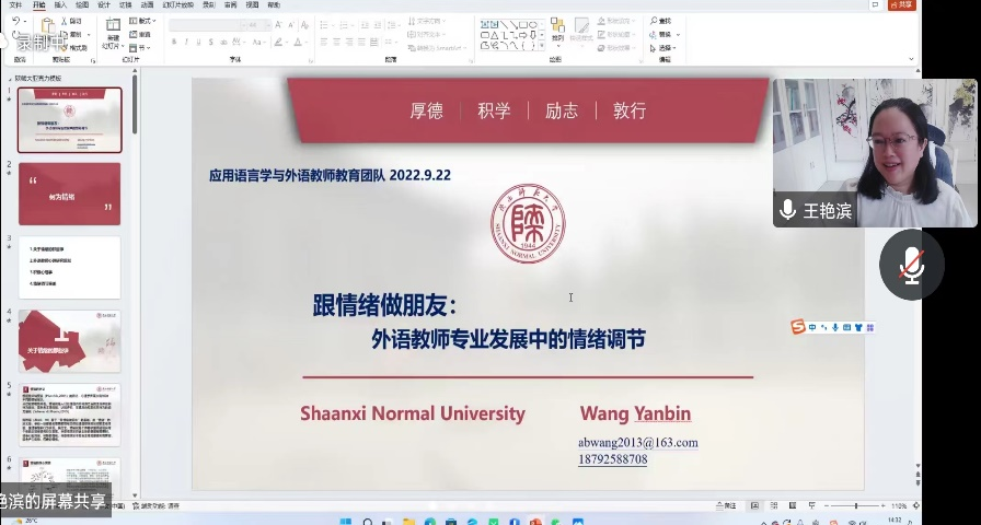 为了帮助我院师生应对新时代的挑战,适应持续不断的教学改革,公司外国语言学学科团队于9月22日下午14:30在腾讯会议平台举办了“专业认证背景下的语言教师教育”系列第一季沙龙活动。beat365王艳滨副教授进行主题为“跟情绪做朋友:外语教师专业发展中的情绪调节”的线上讲座。公司李伟芳副教授担任主持,外国语公司30余名师生参与交流讨论。