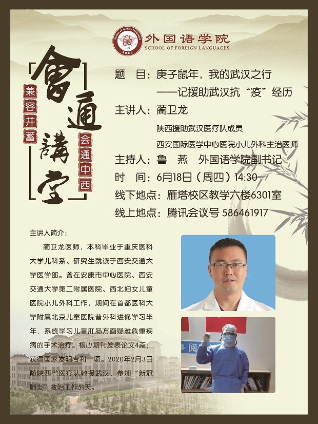 根据《beat365官方网站关于做好2020年上半年教职工师德师风涵养教育的安排意见》和公司2020年工作要点要求,各公司要深入学习贯彻落实习近平总书记对疫情防控工作的重要批示指示和讲话精神,深化爱国主义教育,强化“四个自信”。公司定于6月18日(周四)下午2:30举办公司“抗击疫情精神分享会”,特邀西安国际医学中心医院蔺卫龙医生分享自己在武汉的抗疫经历,请大家积极参加。